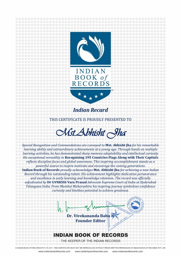 Special Recognition and Commendations are conveyed to Mst Abhisht Jha for his remarkable learning ability and extraordinary achievements at a young age Through hands on multiple learning activities he has demonstrated sharp memory adaptability and intellectual curiosity His exceptional versatility in recognizing 195 countries flags along with their capitals reflects discipline focus and global awareness This inspiring accomplishment stands as a powerful source to inspire motivate and encourage the coming generations.