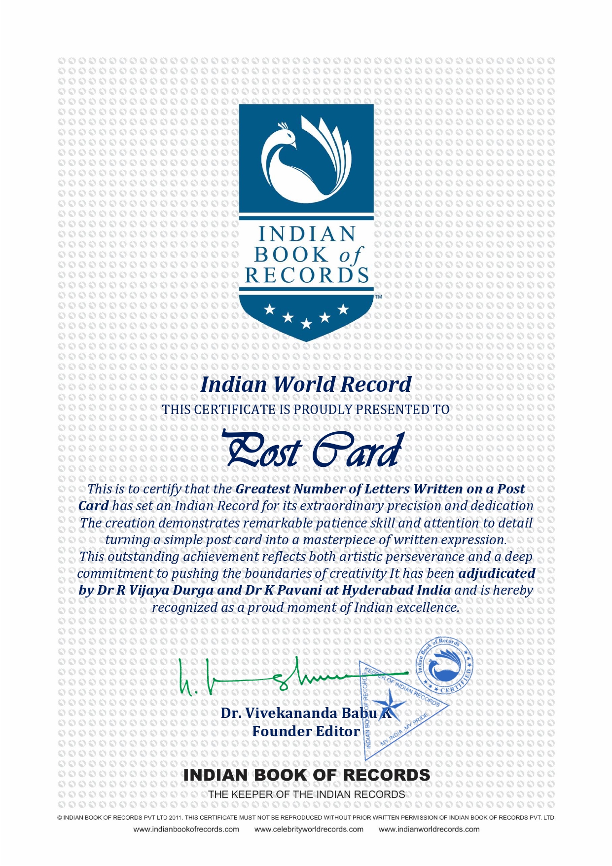 This is to certify that the Greatest Number of Letters Written on a Post Card has set an Indian Record for its extraordinary precision and dedication The creation demonstrates remarkable patience skill and attention to detail turning a simple post card into a masterpiece of written expression.