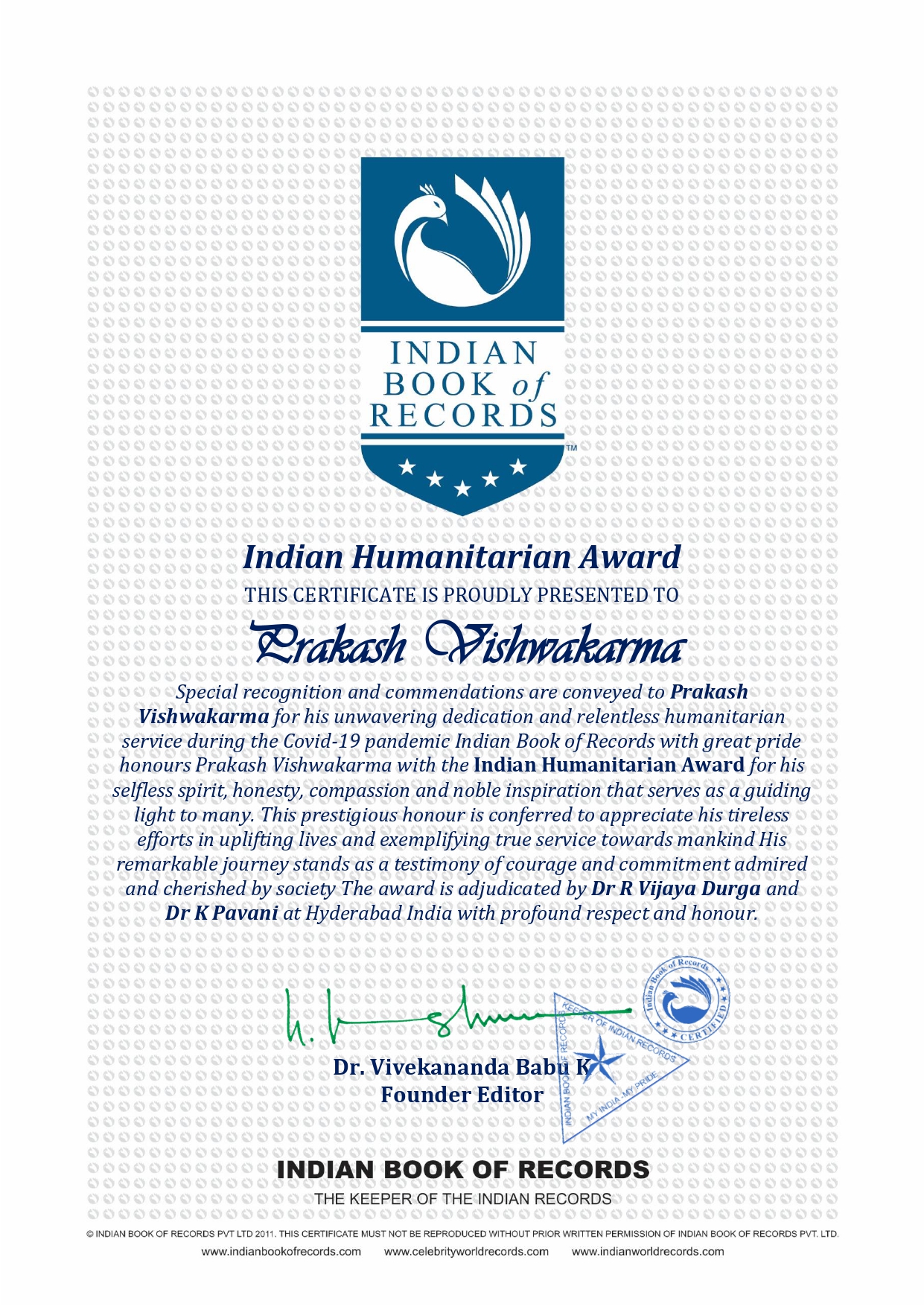 Special recognition and commendations are conveyed to Prakash Vishwakarma for his unwavering dedication and relentless humanitarian service during the Covid-19 pandemic Indian Book of Records with great pride honours Prakash Vishwakarma with the Indian Humanitarian Award for his selfless spirit, honesty, compassion and noble inspiration that serves as a guiding light to many.