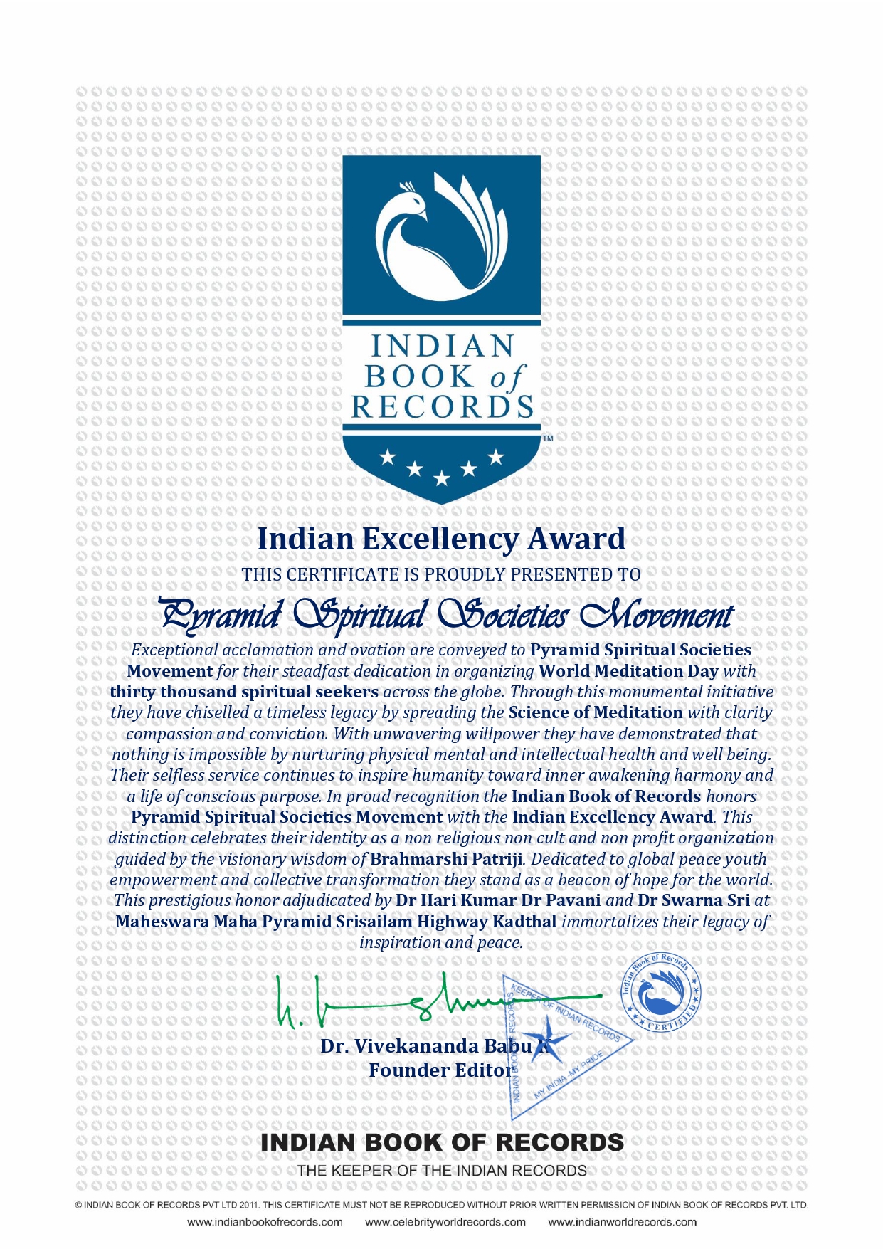 In proud recognition the Indian Book of Records honors Pyramid Spiritual Societies Movement with the Indian Excellency Award This distinction celebrates their identity as a non religious non cult and non profit organization guided by the visionary wisdom of Brahmarshi Patriji Dedicated to global peace youth empowerment and collective transformation they stand as a beacon of hope for the world This prestigious honor adjudicated by Dr Hari Kumar Dr Pavani and Dr Swarna Sri at Maheswara Maha Pyramid Srisailam Highway Kadthal immortalizes their legacy of inspiration and peace.