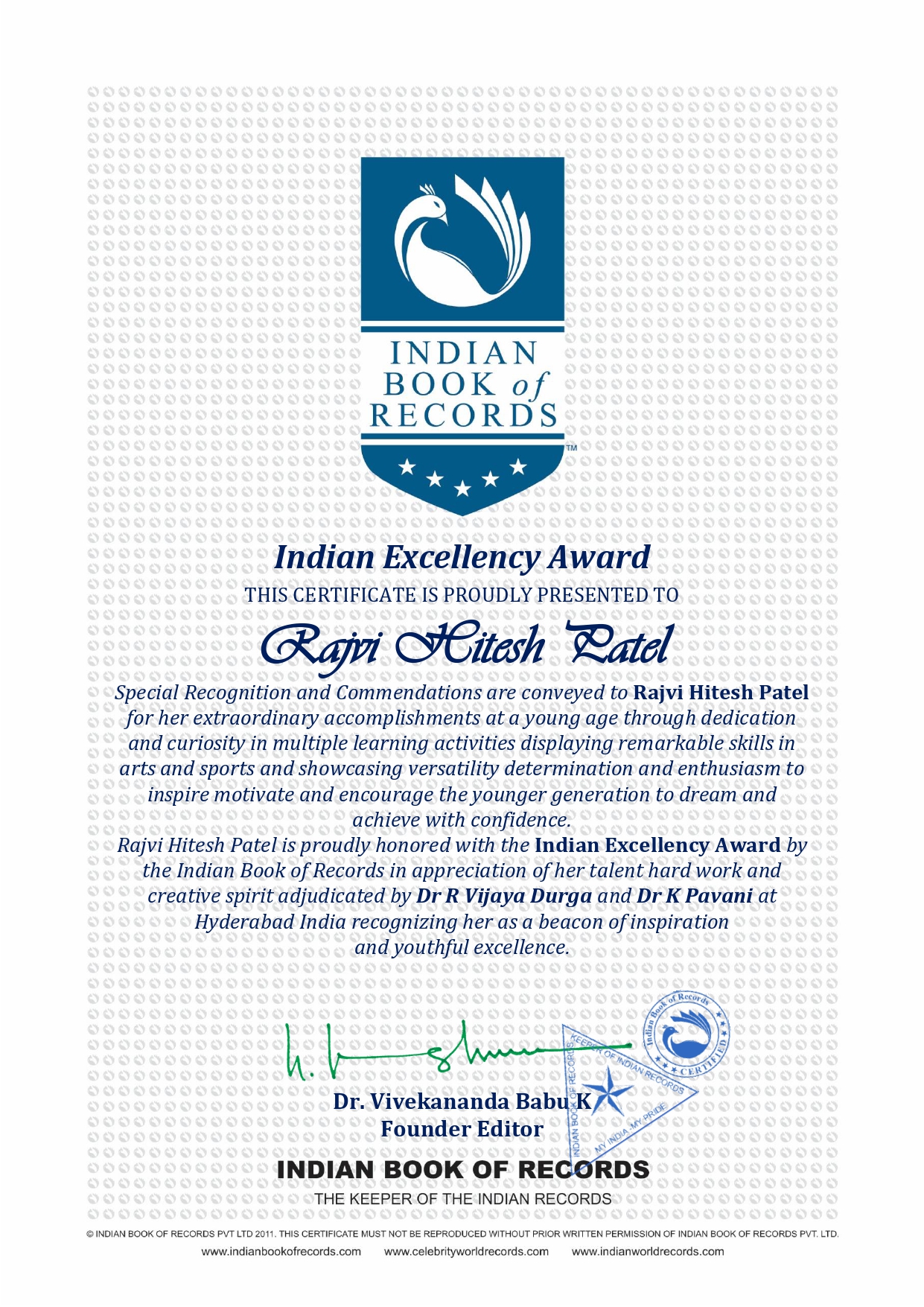Rajvi Hitesh Patel is proudly honored with the Indian Excellency Award by the Indian Book of Records in appreciation of her talent hard work and creative spirit adjudicated by Dr R Vijaya Durga and Dr K Pavani at Hyderabad India recognizing her as a beacon of inspiration and youthful excellence.