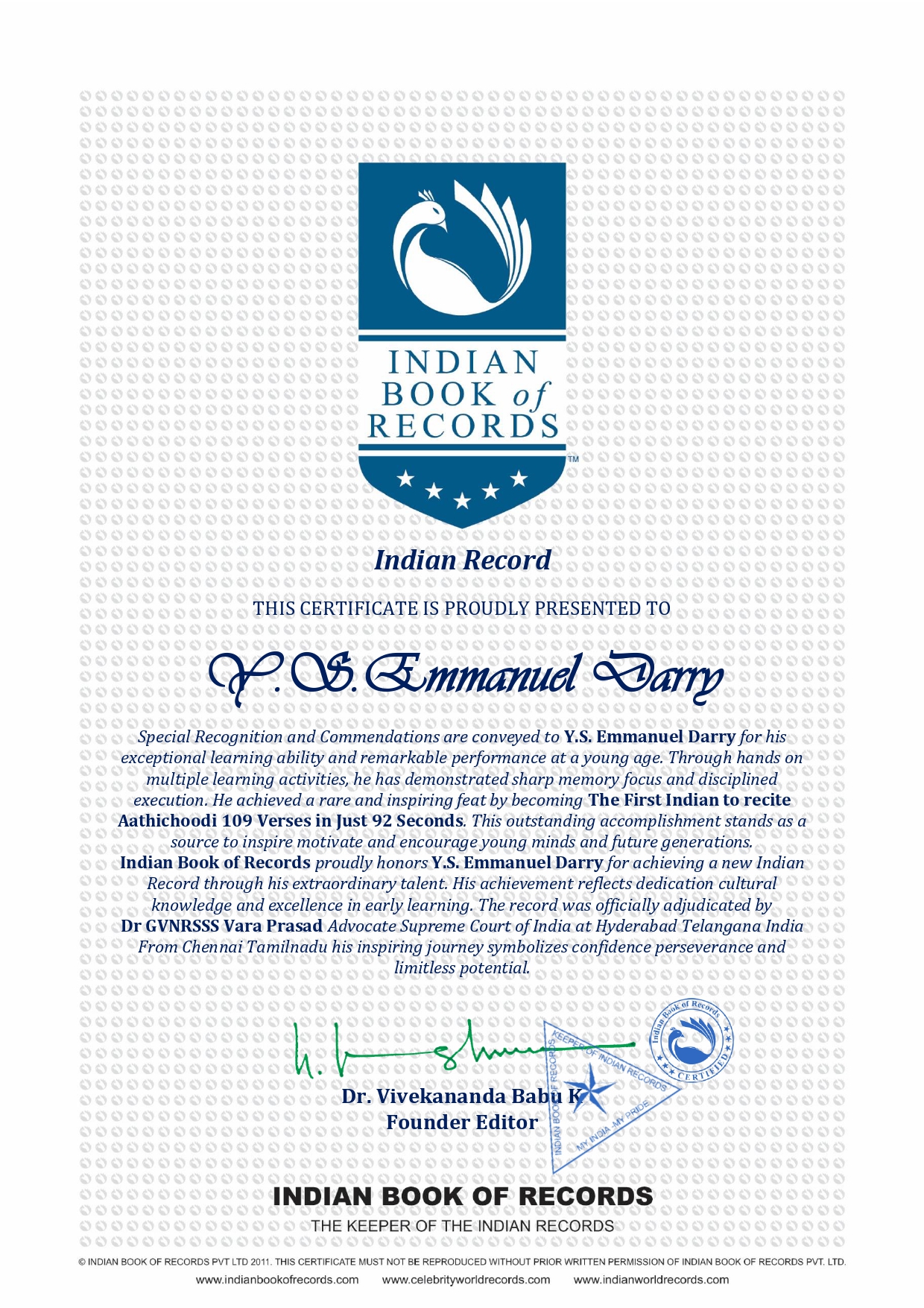 Indian Book of Records proudly honors Y S Emmanuel Darry for achieving a new Indian Record through his extraordinary talent His achievement reflects dedication cultural knowledge and excellence in early learning The record was officially adjudicated by Dr GVNRSSS Vara Prasad Advocate Supreme Court of India at Hyderabad Telangana India From Chennai Tamilnadu his inspiring journey symbolizes confidence perseverance and limitless potential.